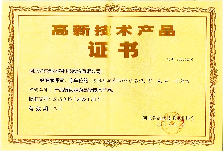 河北彩客新材料科技股份有限公司是一家專注于高性能精細化工產(chǎn)品研發(fā)、生產(chǎn)及銷售的高新技術(shù)企業(yè),主要產(chǎn)品為高性能有機顏料中間體(DMSS、DATA、DMS、DIPS)、食品添加劑中間體 DMAS、新材料聚合單體 BPDA 等。